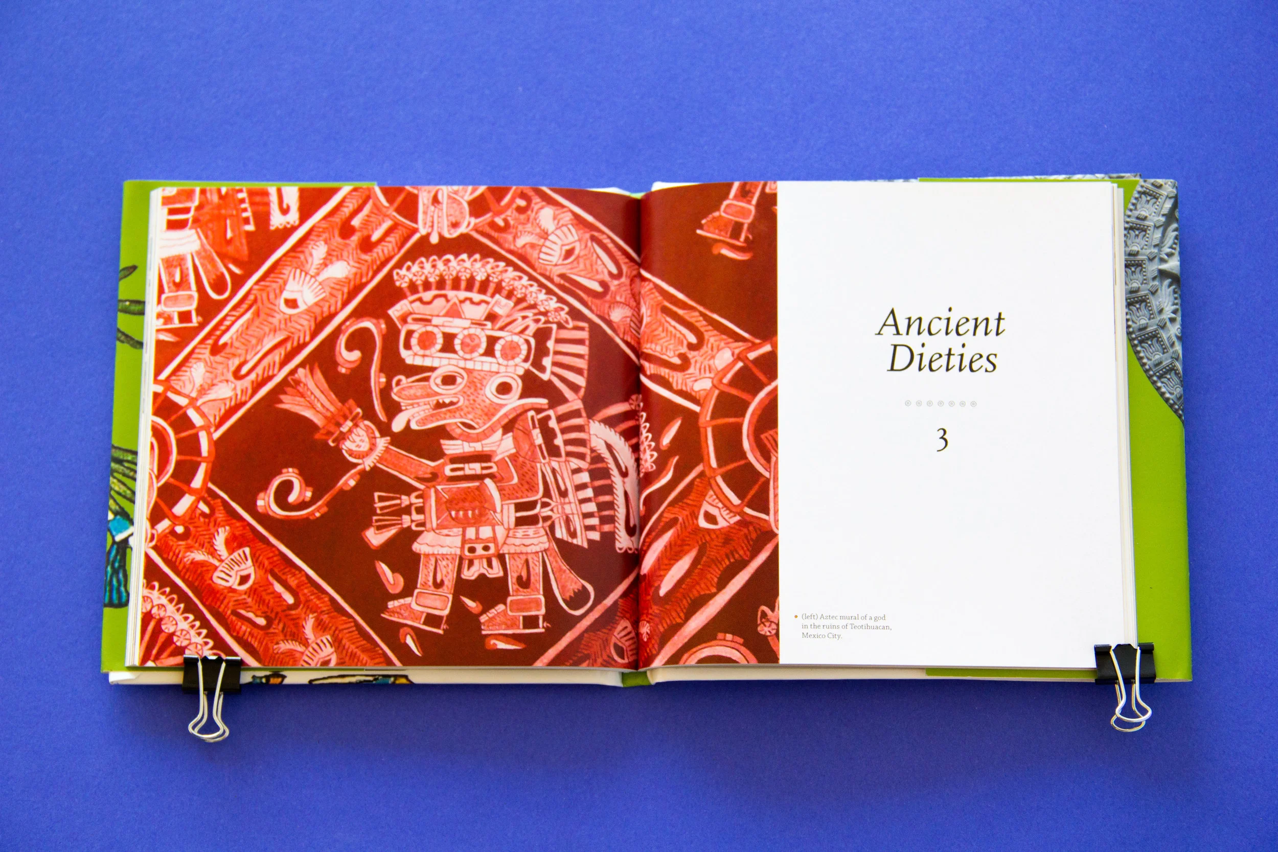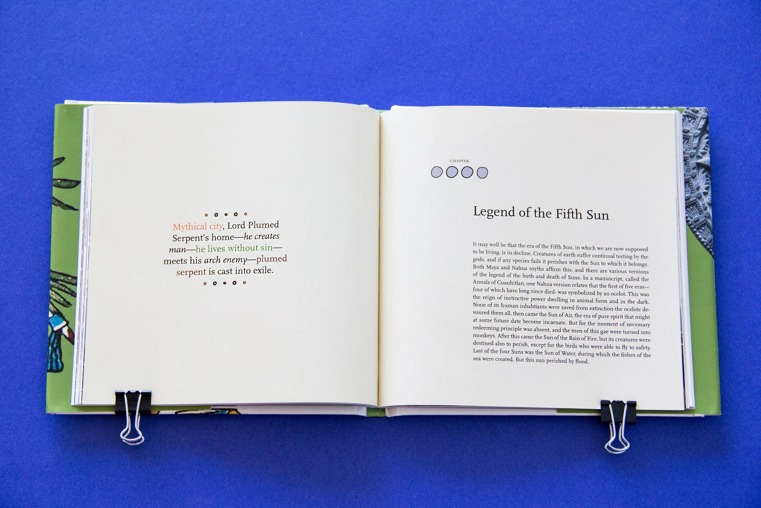 This book highlights myths, gods and goddesses that were important to the Aztecs during pre Columbian times. To make this book stand out, I added small, but unexpected details throughout the book. Instead of using regular chapter numbers, I used the Aztec's numbering system. Each opening chapter highlights a specific quote of one of the stories within the chapter. In my book, you will see that I brought in design elements that Aztecs used in their scribes and incorporated that into the pages.