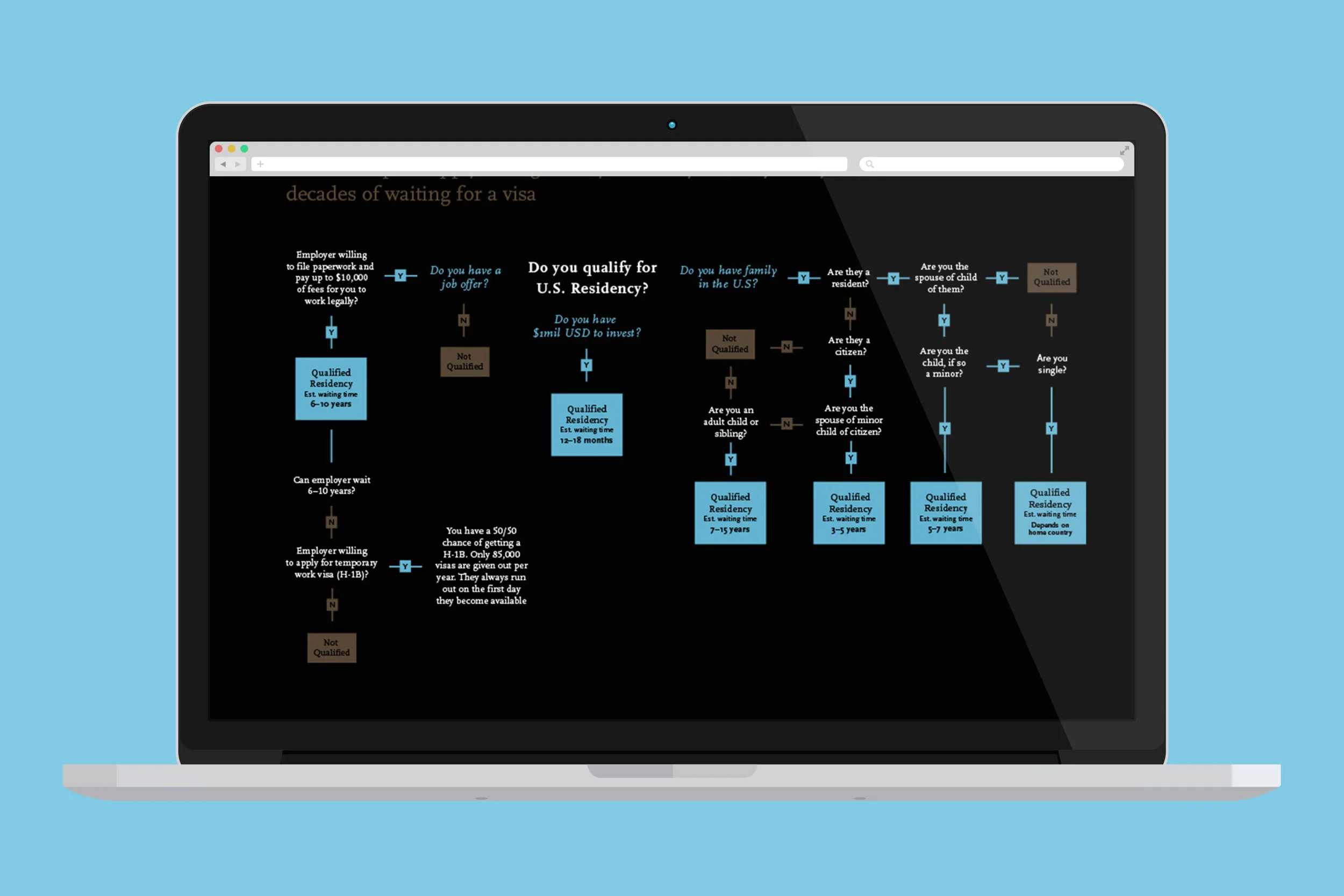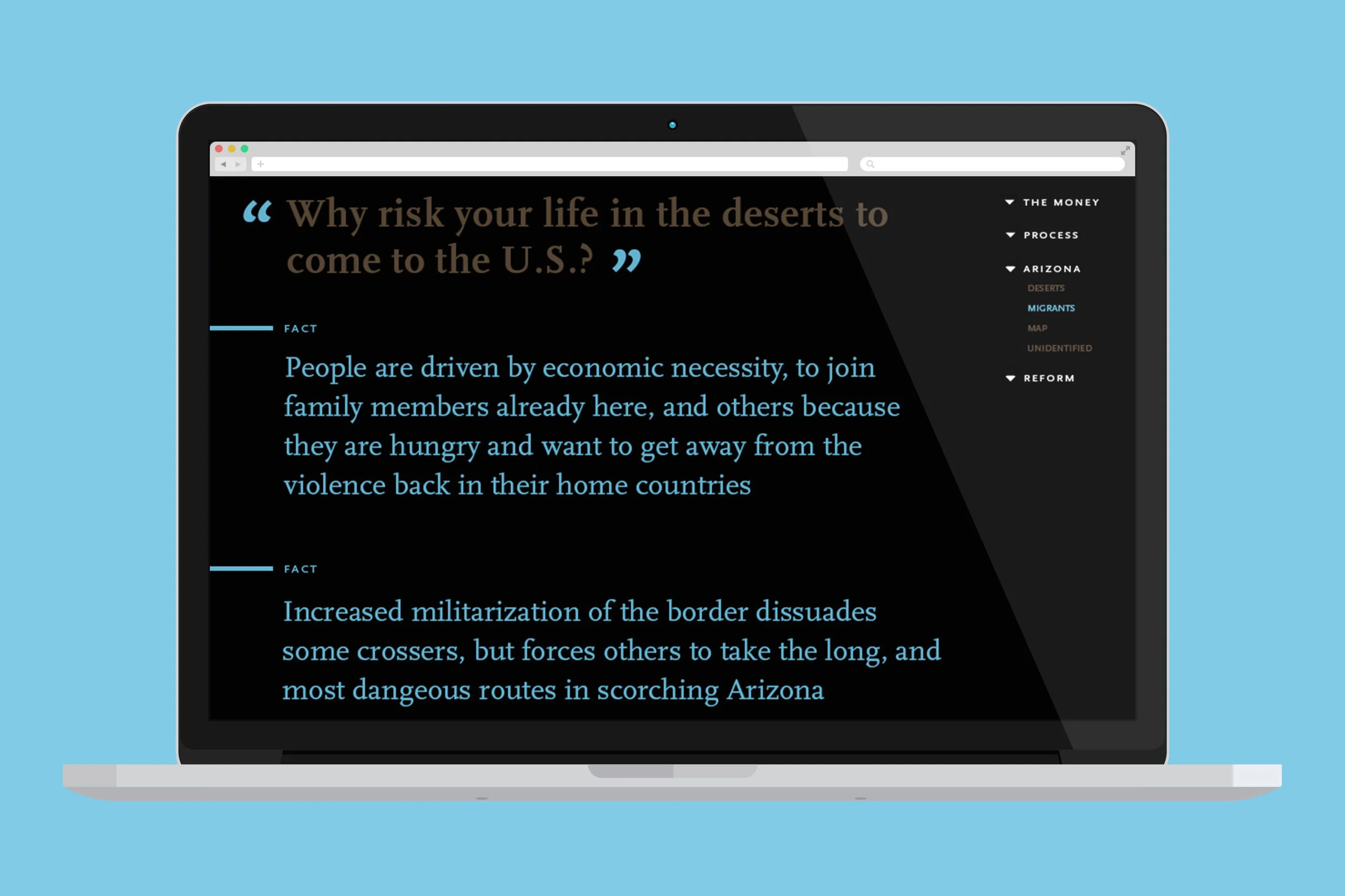 Some people are very misinformed about immigration policies in the U.S. and don't realize how hard it is to enter the country the "right way". I aimed to make a website that debunks myths and misconceptions with statistics and infographics. I divided the the website into three major pages talking about money, the process and then focusing on Arizona so people are informed about what is happening to migrants there.